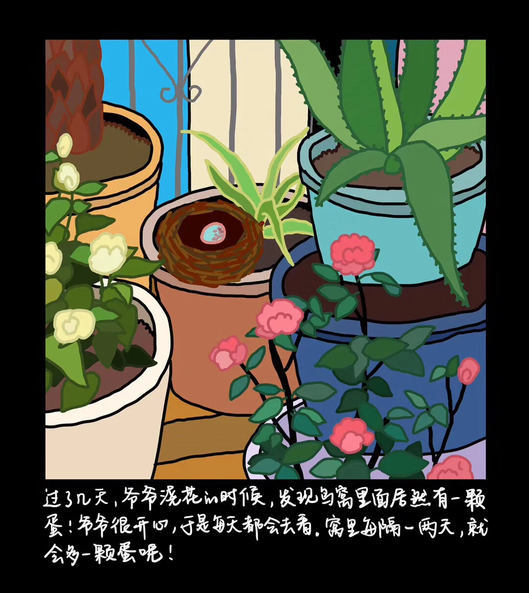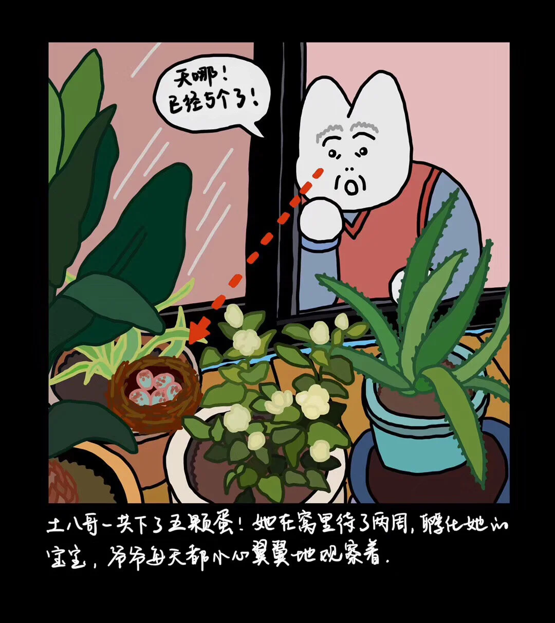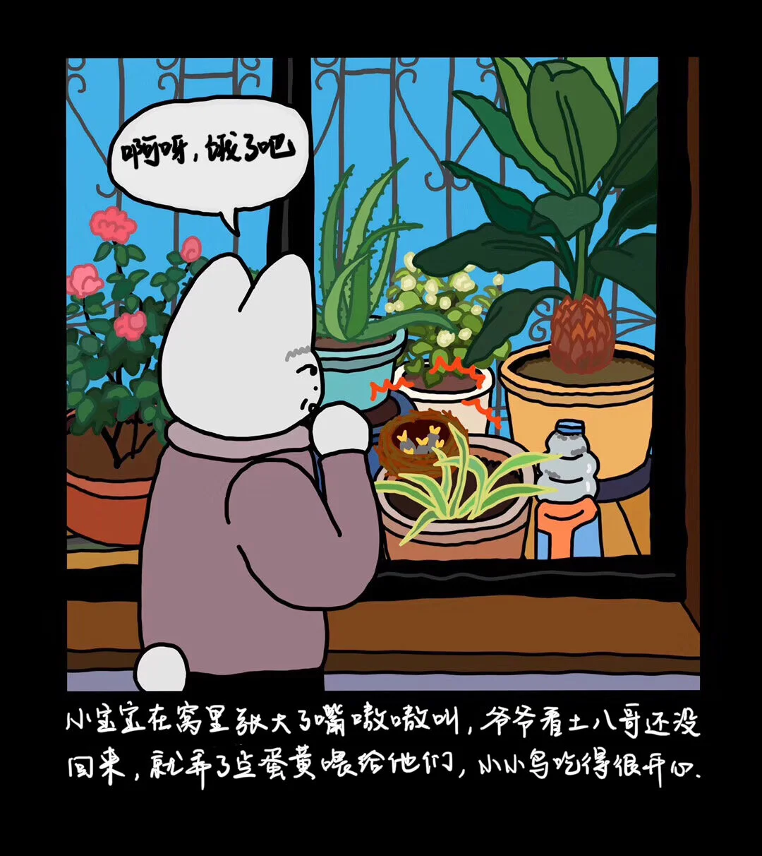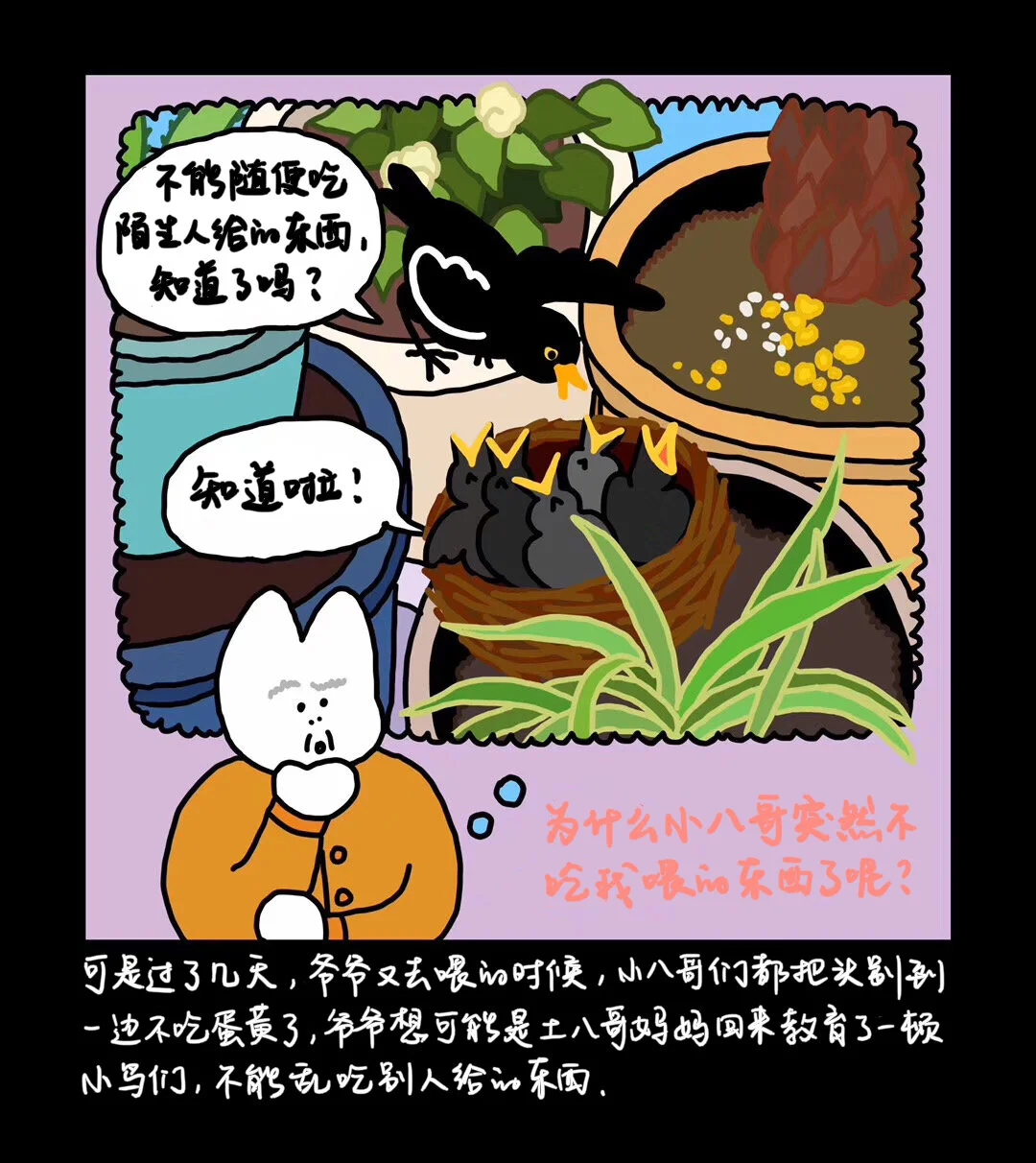 Every day, Grandpa fed them with egg yolks and took good care of them until one day, the little mynas became fully-fledged, and they all left grandpa's windowsill.