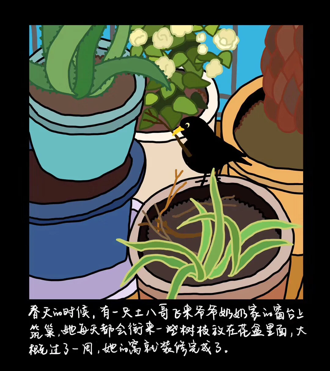 One day, a myna passed by grandpa’s windowsill and began to build her nest there.