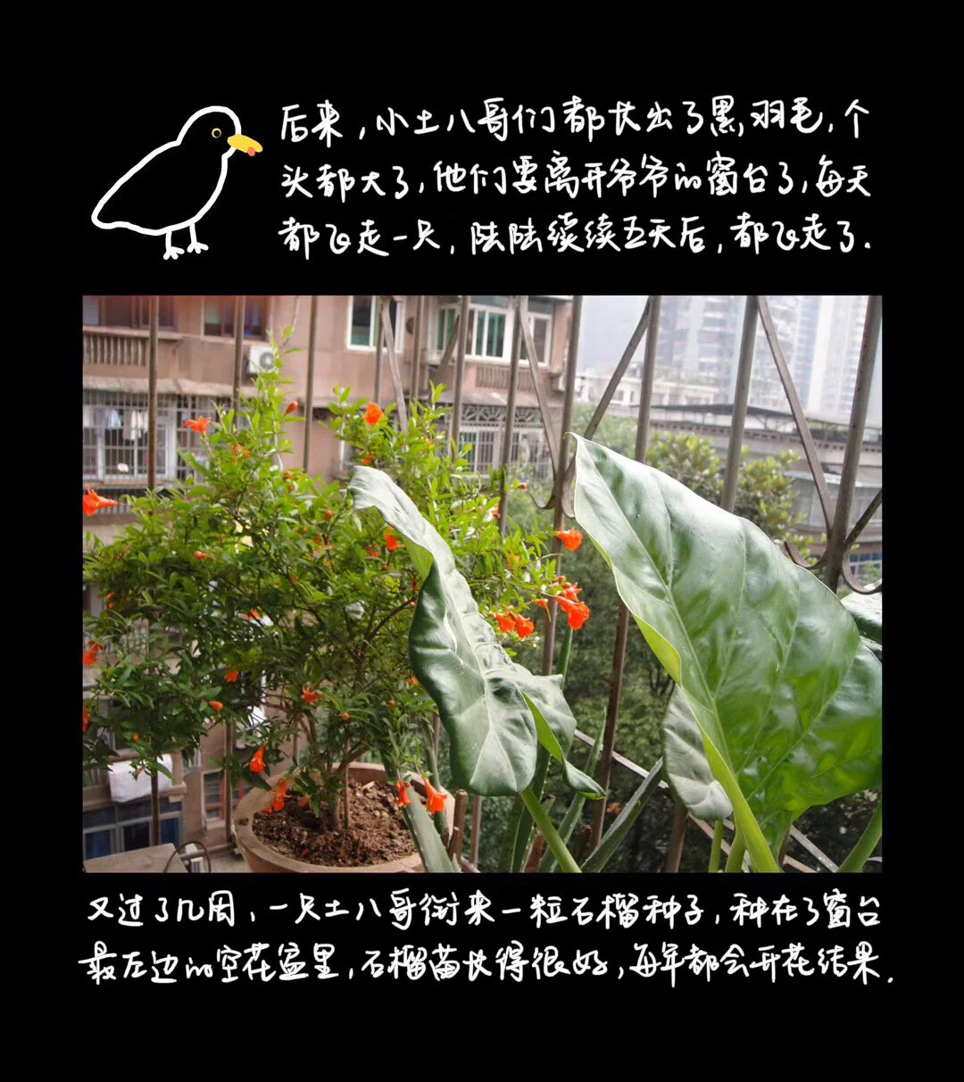 Grandpa felt sad. To his joy, however, a few days later, one of the mynas took a pomegranate seed back and planted it in a pot on the window sill.